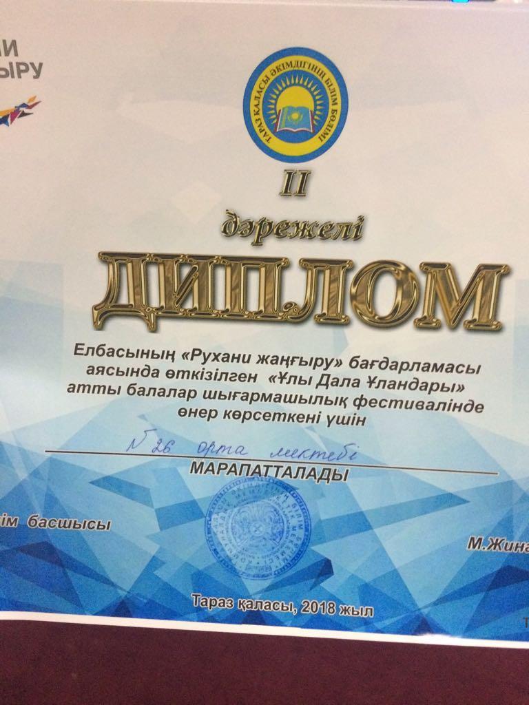 Тараз қаласындағы Баласағұн мәдениет үйінде Елбасының "Рухани жаңғыру" бағдарламасы аясында өткізілген "Ұлы Дала Ұландары" атты балалар шығармашылық фестиваль өтті. Фестивальда қалалық мектептерден іріктеп алынған мектептер өнер көрсетті. Абай атындағы №26 орта мектептен 70 оқушы хор айтты және дефилеге 4 оқушы сән көрсетуге шықты. Фестиваль аяқталған соң қорытынды шықты. Қорытынды бойынша мектебіміз II дәрежелі орын алды.