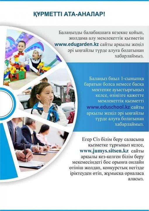 29 май 2019 0 1 2 3 4 5 ҚҰРМЕТТІ АТА- АНАЛАР! Облыстың барлық мектебіне балаларды 1 сыныпқа қабылдау автоматтандырылды. Енді үйде отырып-ақ мектепті таңдауға болады. Ол үшін 1 маусымнан бастап, eduschool.kz сайты арқылы өтініш бере аласыз.