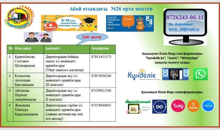 06 апрель 2020 0 1 2 3 4 5 Call орталық Мектебімізде қашықтықтан оқытуға байланысты әдістемелік-техникалық көмек көрсету және ата-аналардың сұрақтарына жауап беру мақсатында Call орталық құрылды