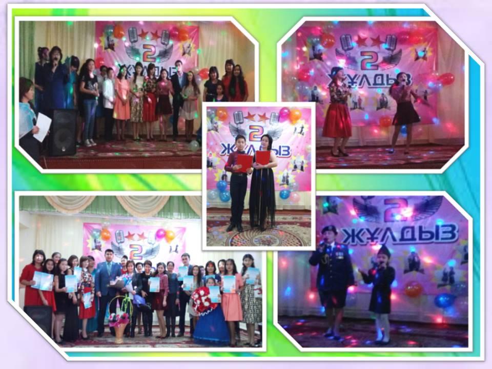 19 июнь 2017 0 1 2 3 4 5 Сыныптан тыс іс-шара "Екі жұлдыз" ән байқауы Сыныптан тыс іс-шара арқылы мұғалім мен оқушы ынтымақтастығын қалай нығайтуға болады? деген тақырыпта мұғалім мен оқушы арасындағы ынтымақтастықты орнату мақсатында екі жұлдыз ән байқауы өткізілді.