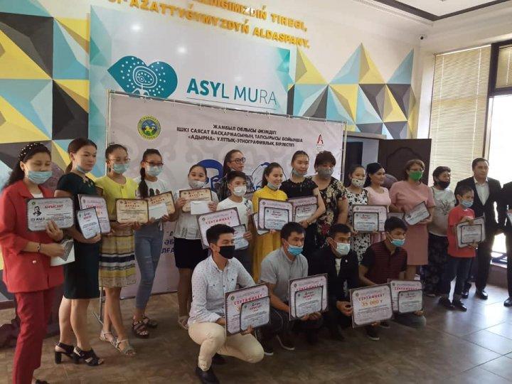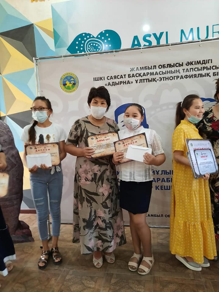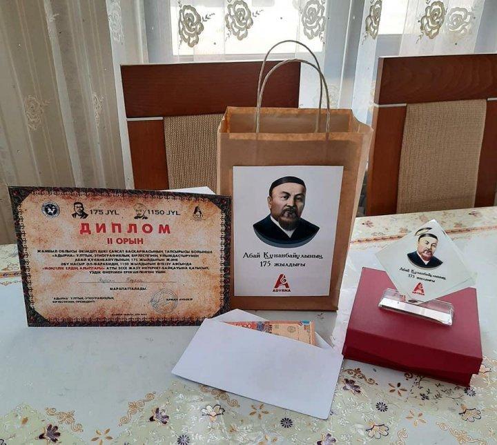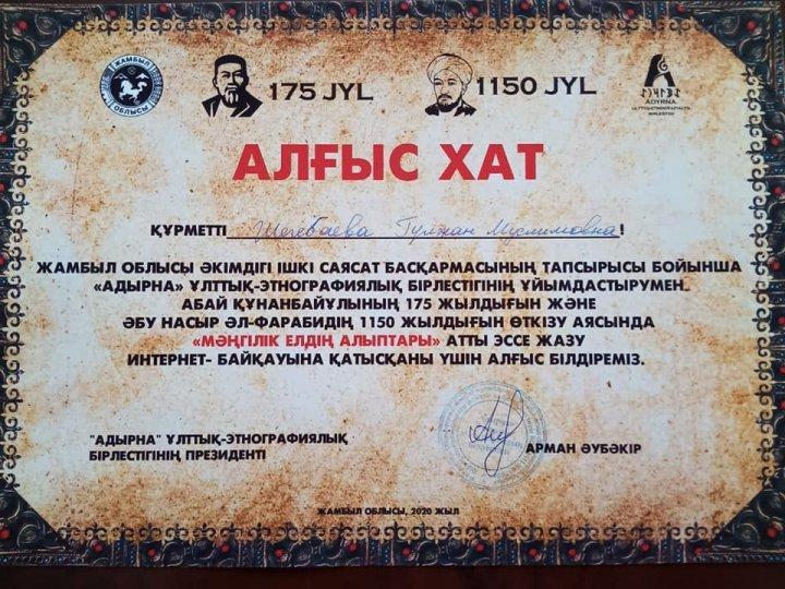 Жамбыл облысы әкімдігі ішкі саясат басқармасының тапсырысы бойынша "Адырна" ұлттық-этнографиялық бірлестігінің ұйымдастыруымен Абай Құнанбайұлының 175 жылдығын және Әбу Насыр Әл-Фарабидің 1150 жылдығын өткізу аясында "Мәңгілік елдің алыптары" атты эссе жазу интернет-байқауына қатысқаны үшін алғыс қазақ тілі пәнінің мұғалімі Шегебаева Гүлжан Муслимқызы және 7 "В" сынып оқушысы Тұрсын Назиля ІІ дәрежелі дипломмен марапатталды