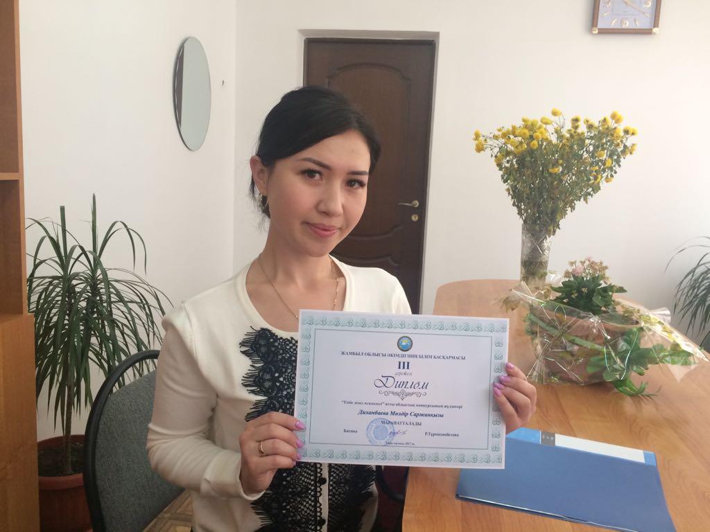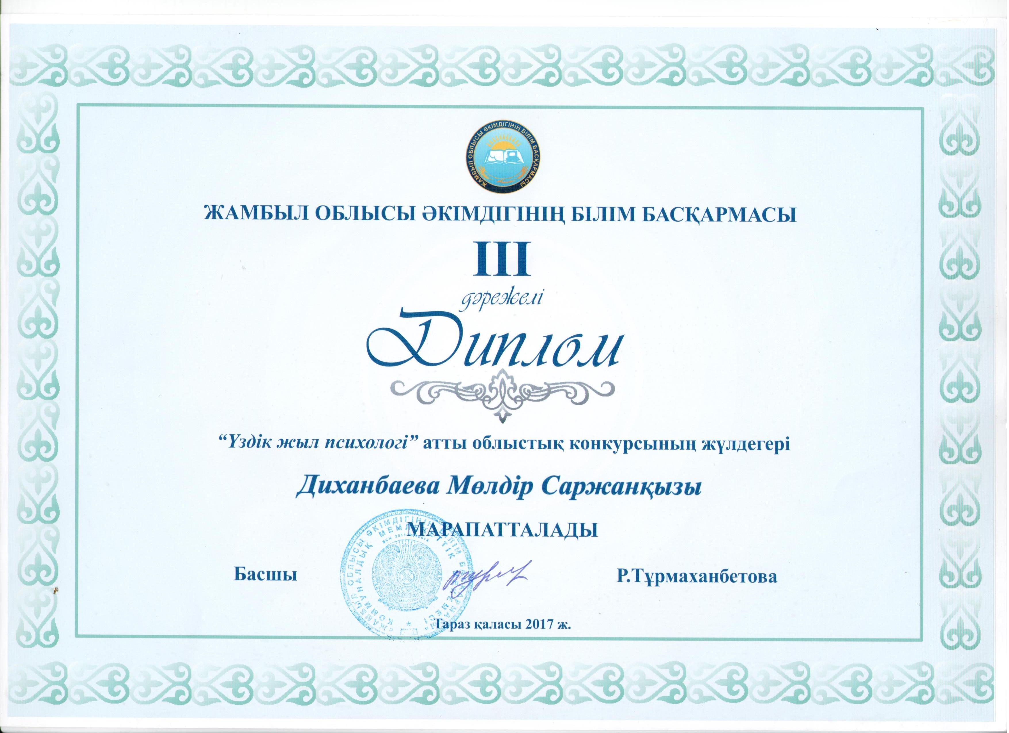 2017 жылдың қазан айында "Ең үздік жыл психологі" атты облыстық байқау өткізілді. Байқаудың басты мақсаты талантты, шығармашылықпен жұмыс істейтін, өз кәсіптік біліктілігін көрсете алатын психологтарды анықтау, қолдау және мадақтау(ынталандыру) болып табылады. Байқауға 6 жыл еңбек өтілі бар психолог Диханбаева Мөлдір қатысты. Байқау 2 кезеңде өткізілді. Мөлдір кәсіби шеберлігін (ата-аналар, педагогтар, балалар мен жұмыс істеу қабілеті), психологиядан теориялық білімін, жалпы жан-жақтылығы мен мәдениетін көрсете білді. Байқаудың І кезең-аймақтық І орынды жеңіп алып, ІІ кезең - облыстық ІІІ орынды иеленді. Мөлдір ІІІ дәрежелі Дипломмен марапатталды.