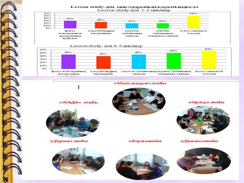 4-11 сынып оқушылары арасынан нысаналы сыныптар анықталды. Lesson study тәжірибесі енгізілді, LS сабақтарының зерттеу мақсаттары нақты қойылды. Сегіз фокус топтары құрылып, зерттеу сабақтары жүргізілді. Әр топта 7-8 мүшеден болды. Топ мүшелері тағайындалып, міндеттері нақтыланды. Фокус топтары циклдер арқылы сабақты зерттеді.