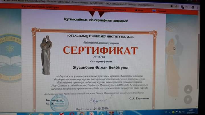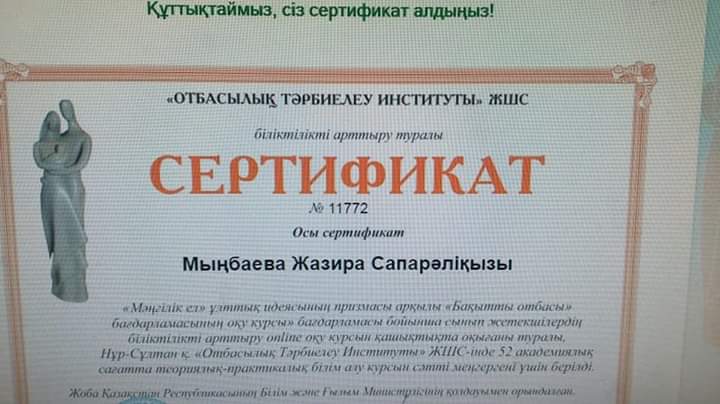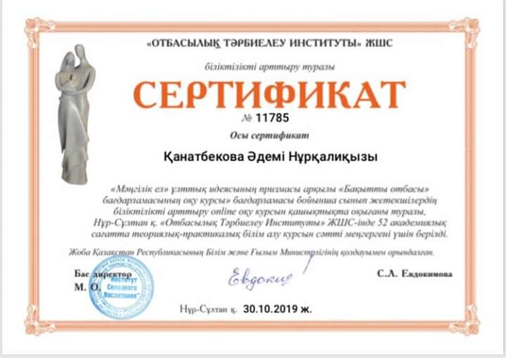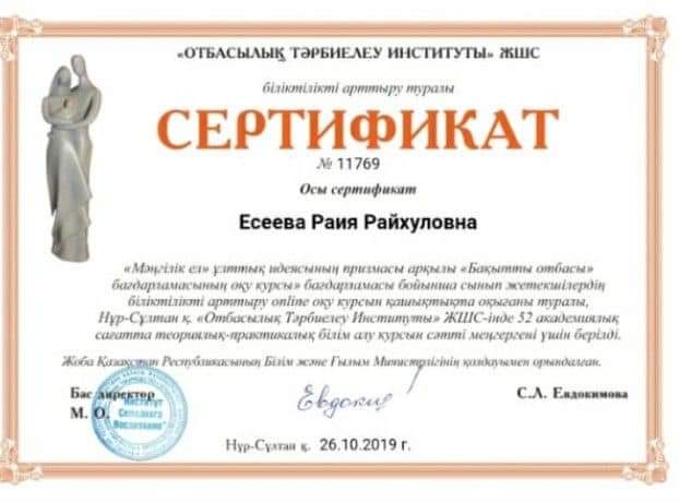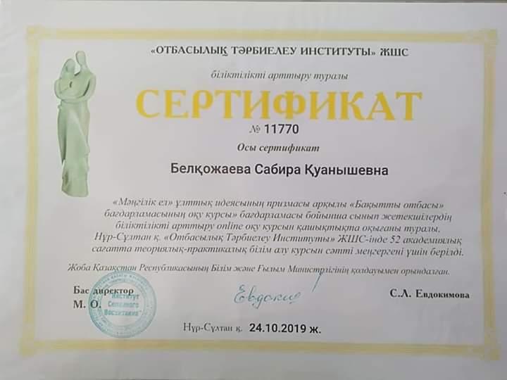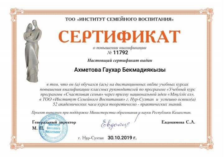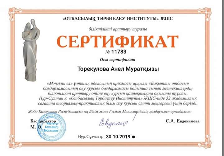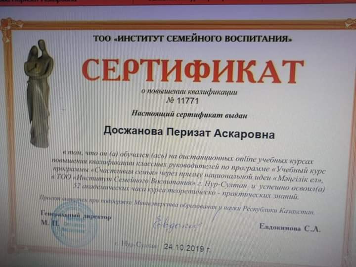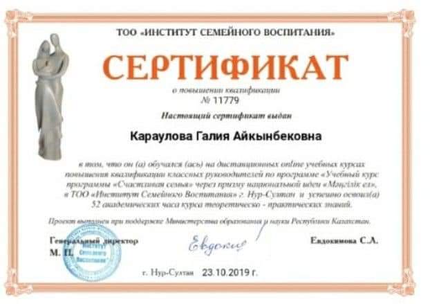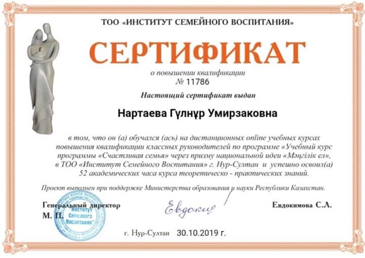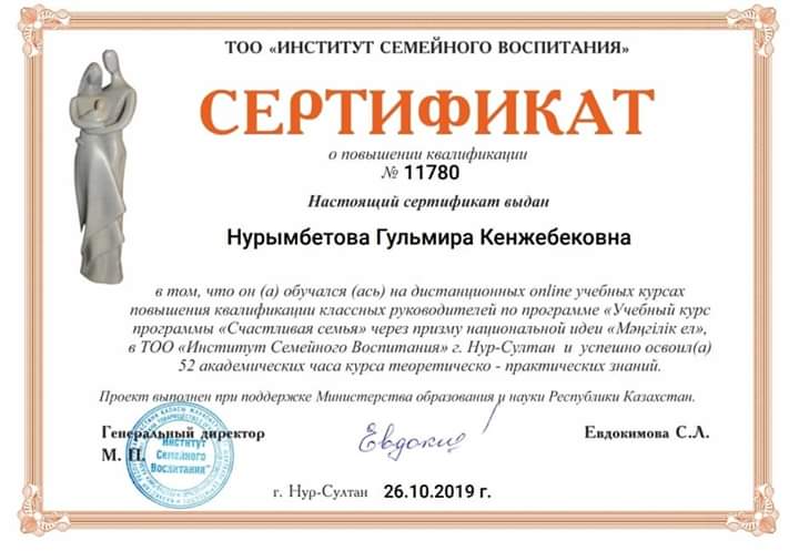 28 ноябрь 2019 0 1 2 3 4 5 "Бақытты отбасы" оқу курсы "Отбасылық тәрбиелеу институтының" ұйымдастыруымен өткізілген 52 сағаттық "Бақытты отбасы" оқу курсы бағдарламасын барлық дерлік сынып жетекшілеріміз меңгерді