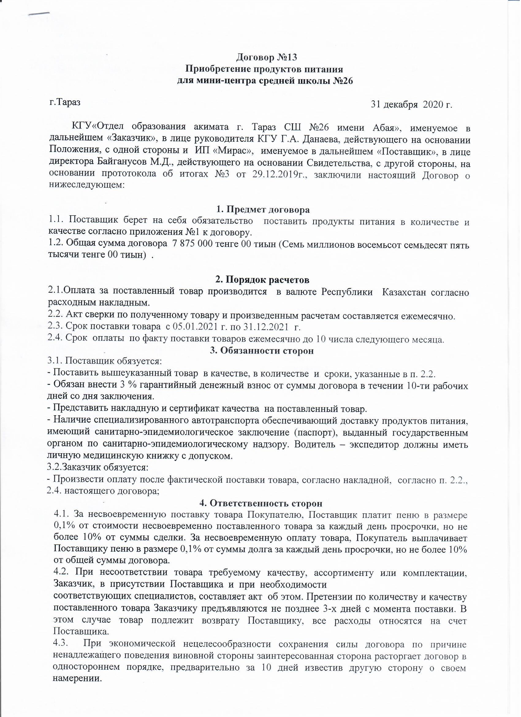 » Шағын орталықты тамақпен қамтамасыз етуге келісім шарт