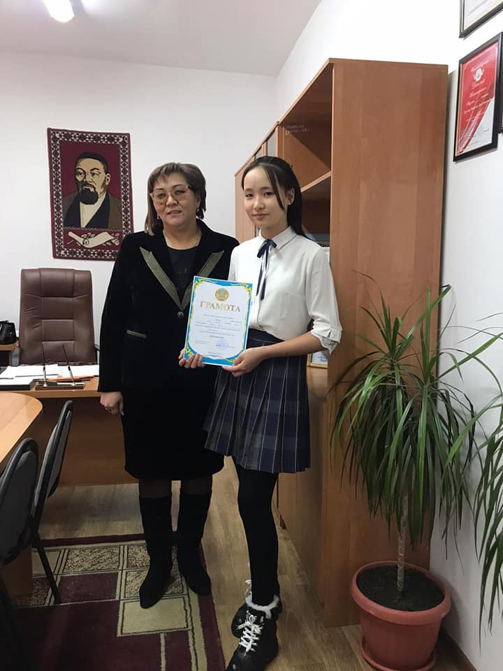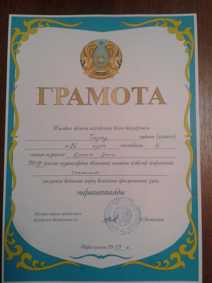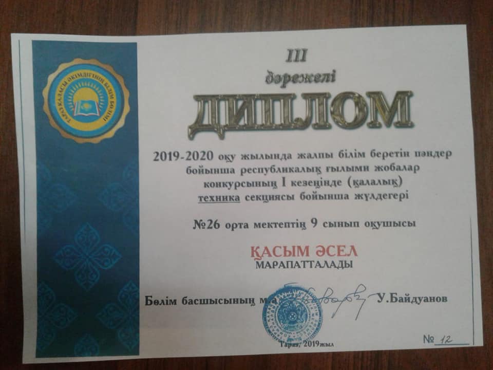 Абай атындағы №26 орта мектебінің 9 сынып оқушысы Қасым Әсел қалалық ғылыми жоба байқауында жүлделі ІІІ дәріжелі дипломмен және облыстық байқауда алғыс хатпен марапатталды. Ғылыми жоба тақырыбы «Мектеп оқушыларының табандарын антропометриялық зерттеу». Жоба жетекшісі А. Райымбекова. Қасым Әселді жеңісімен құттықтап, алдағы уақытта үлкен жетістіктер мен шығармашылық табыс тілейміз.
