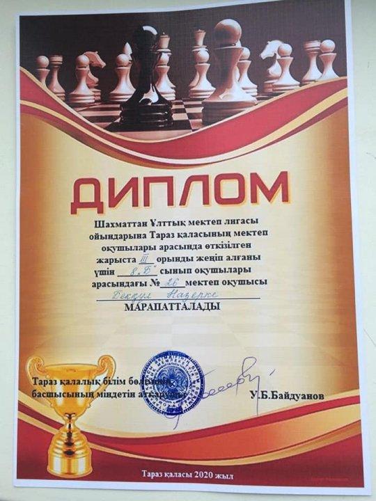 15 январь 2020 0 1 2 3 4 5 Шахматтан Ұлттық мектеп лигасы ойындары Шахматтан Ұлттық мектеп лигасы ойындарына Тараз қаласының мектеп оқушылары арасында өткен жарыста 11 сынып оқушылары Досымбек Нұрдос пен Асқар Мухим жүлделі ІІ орынды, ал 8 сынып оқушылары Бекқұл Дінмұхамед, Бекқұл Назерке, Өмірзақов Нұрым, Бақыт Алинұр жүлделі ІІІ орынды иеленді.