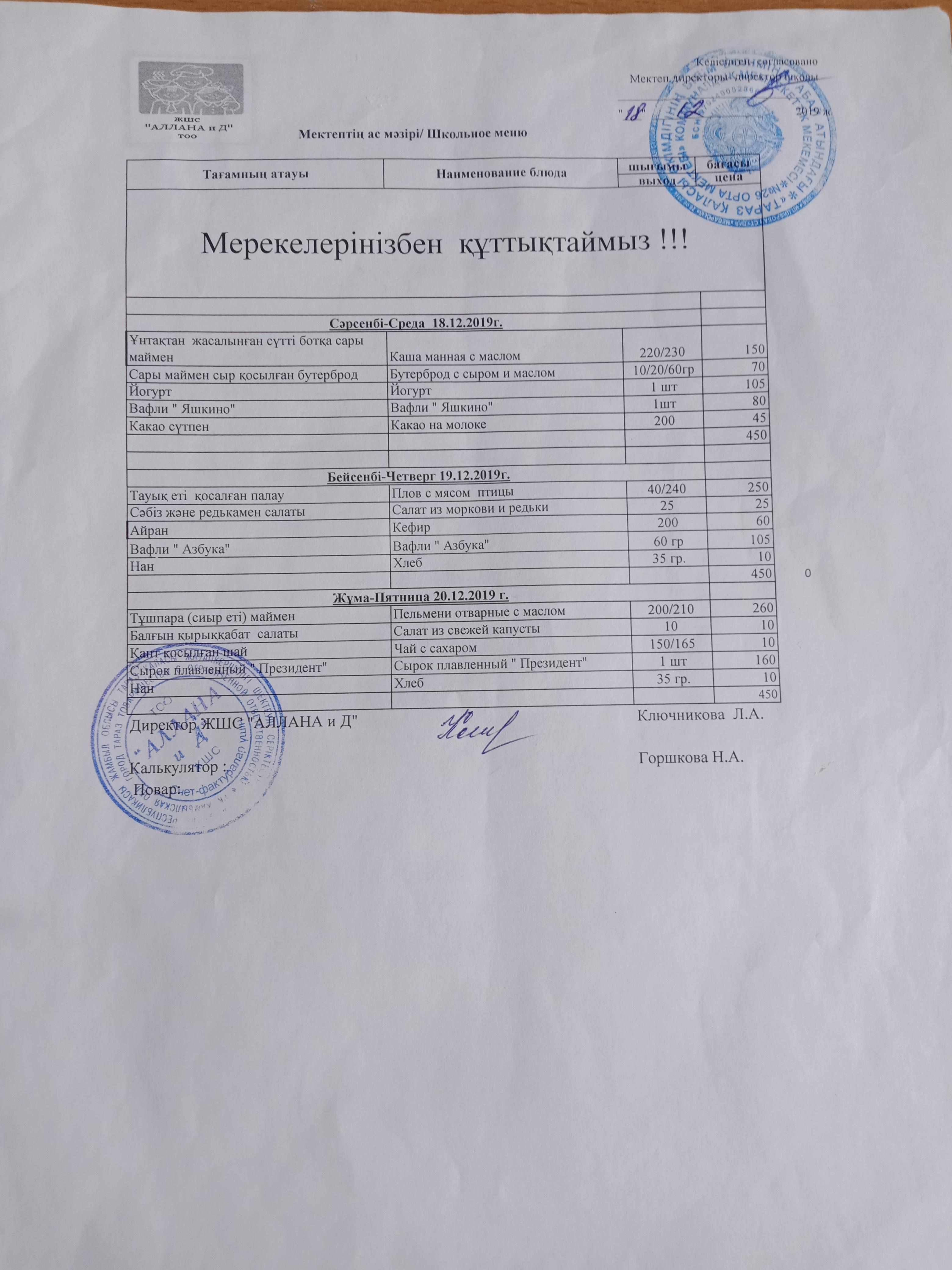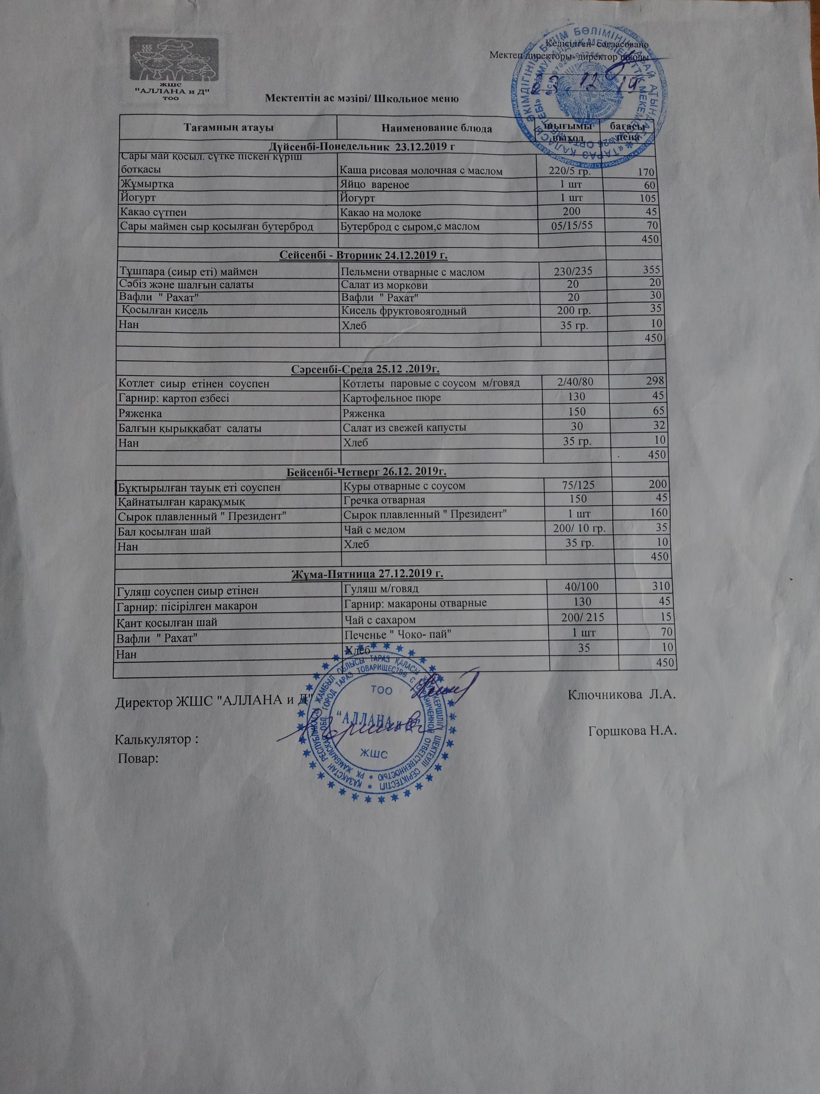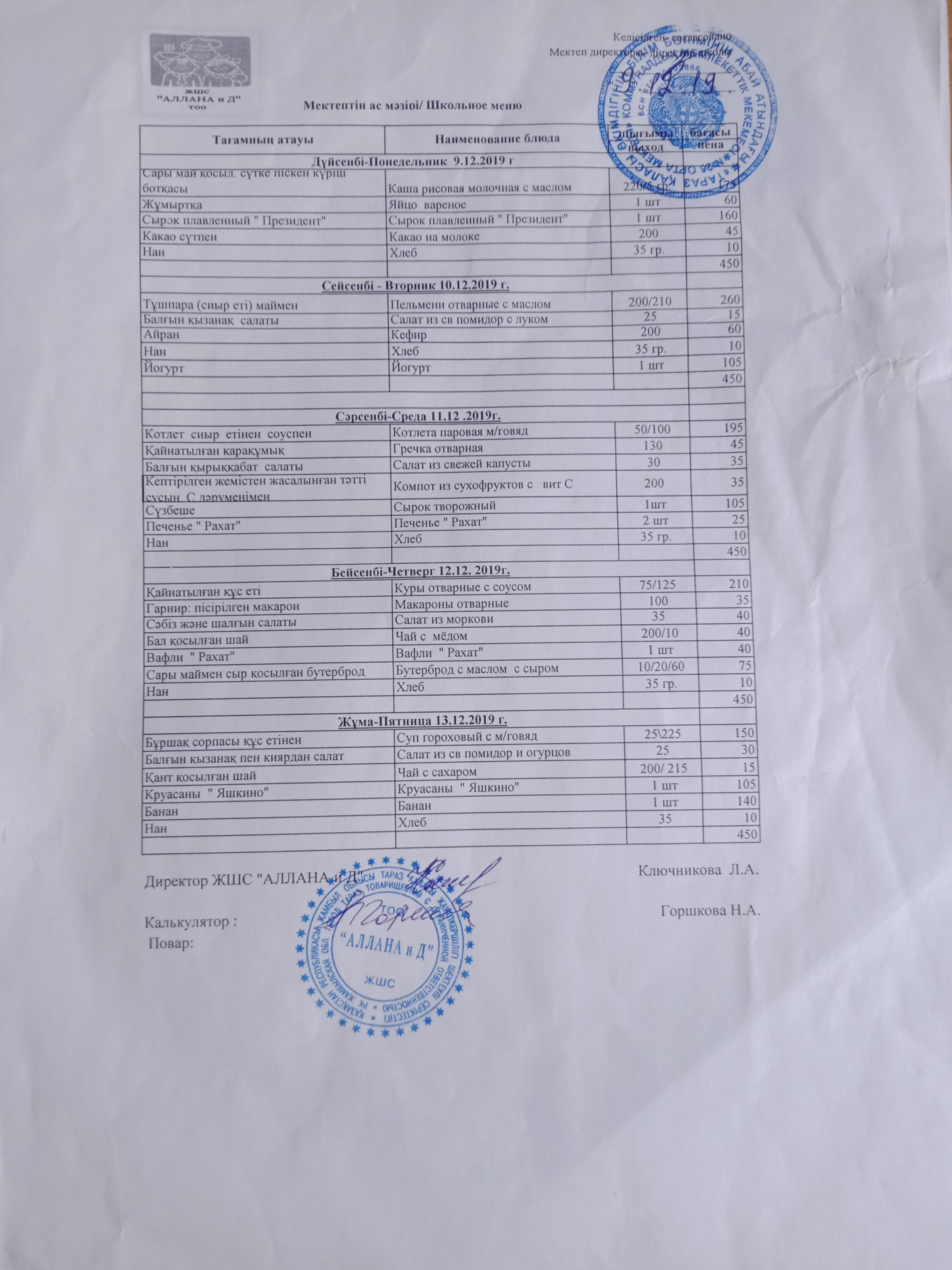 Ақпан айындағы мектеп оқушыларының асханадағы ас мәзірі