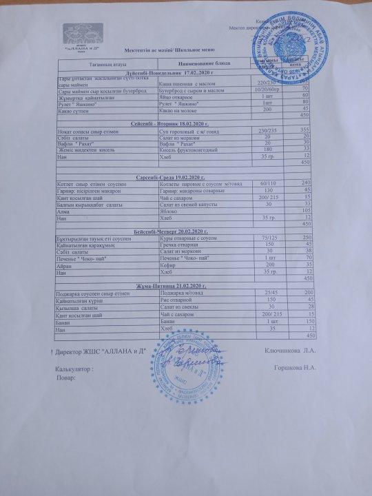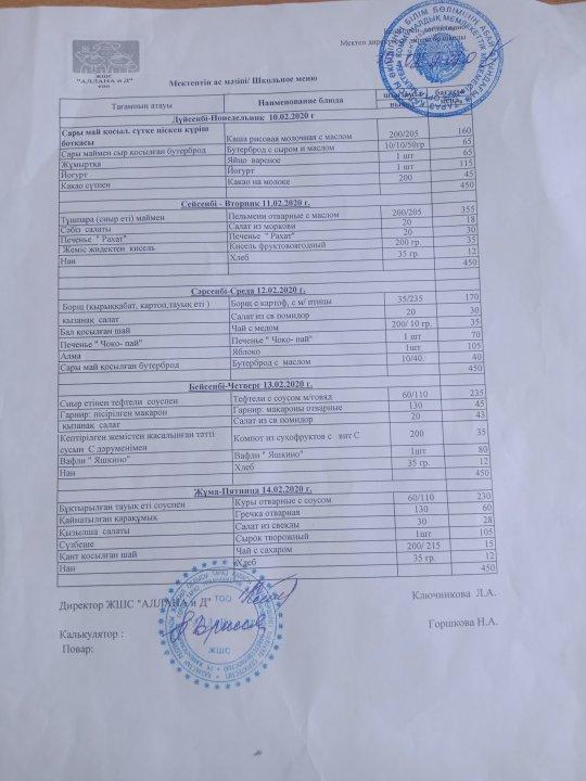Ақпан айындағы мектеп оқушыларының асханадағы ас мәзірі