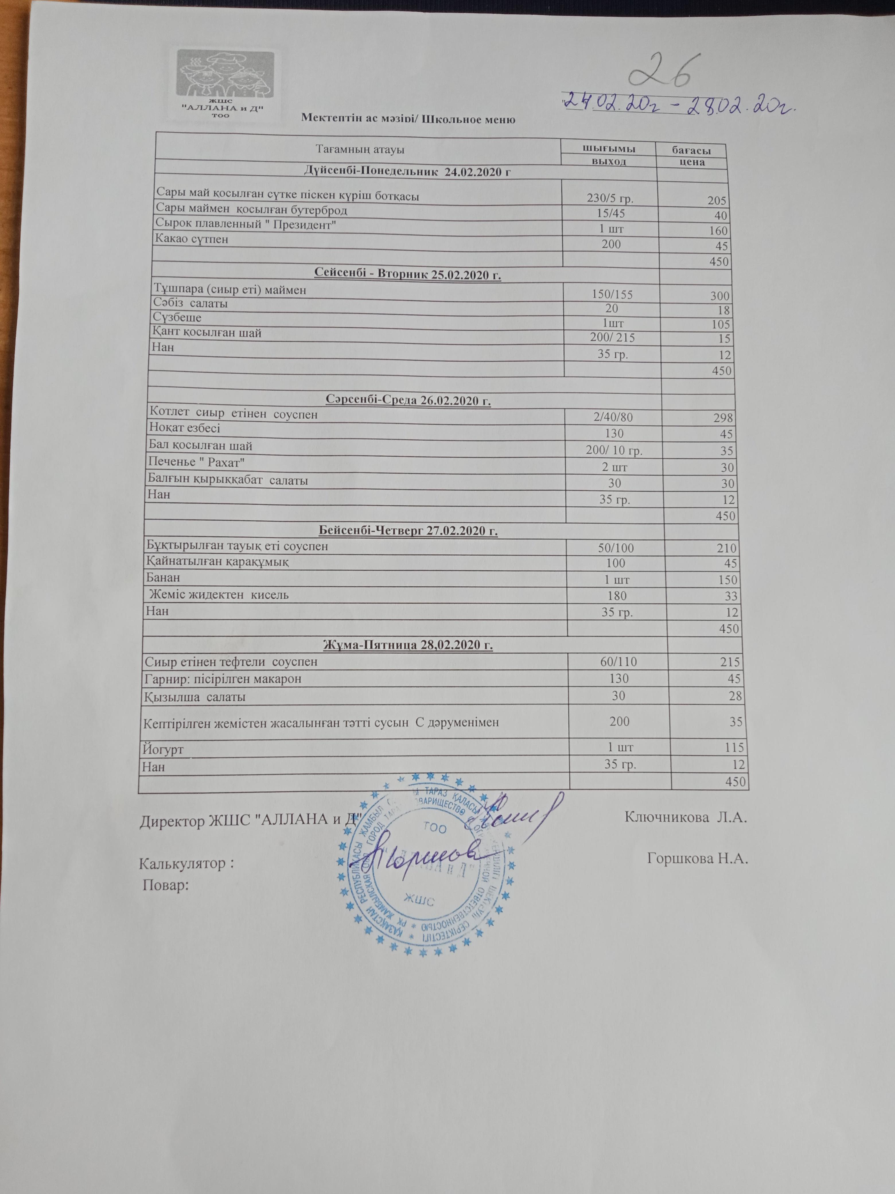 Ақпан айындағы мектеп оқушыларының асханадағы ас мәзірі