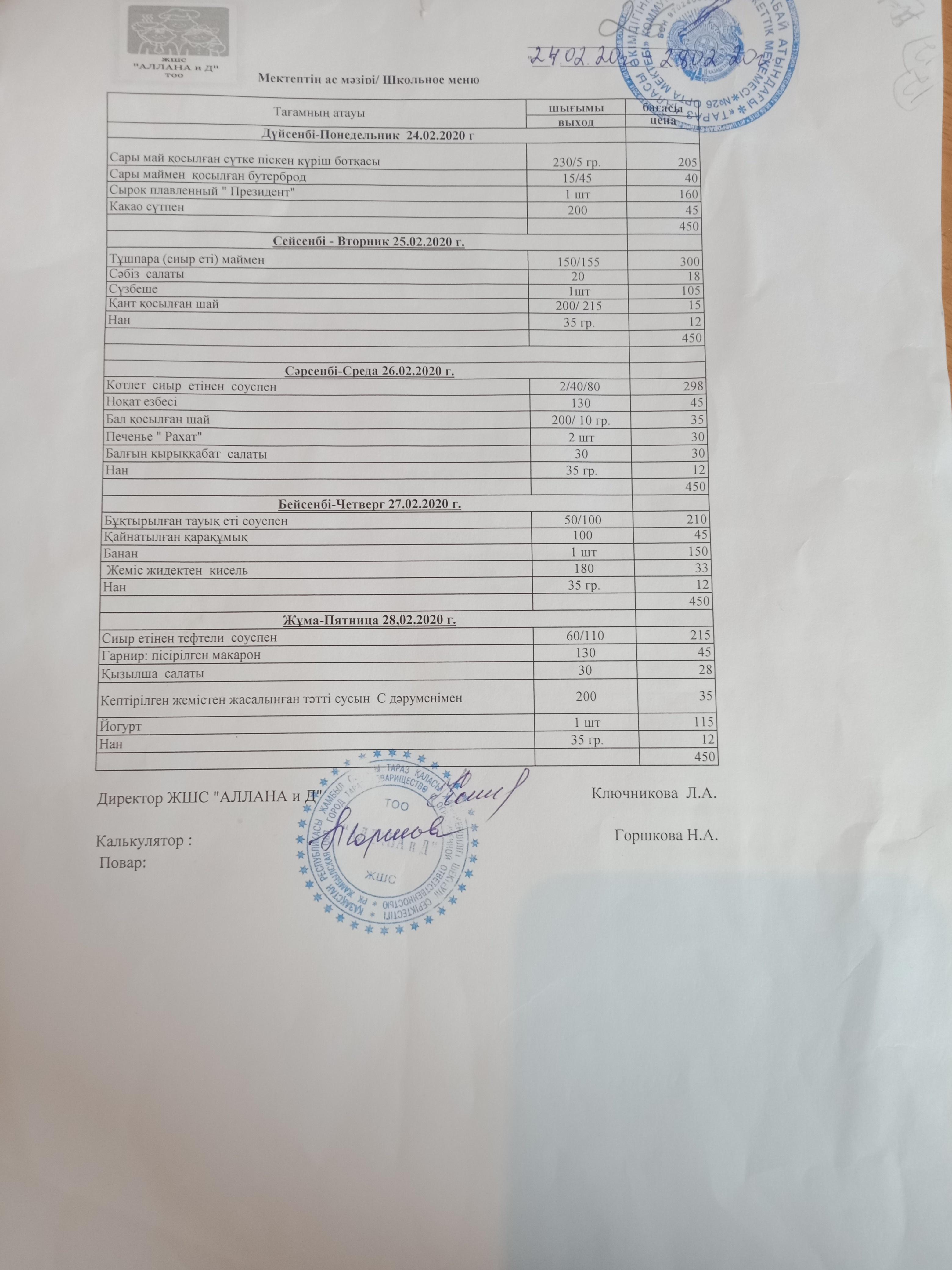 24.02.2020-28.02.2020 Ақпан айындағы апталық ас мәзірі