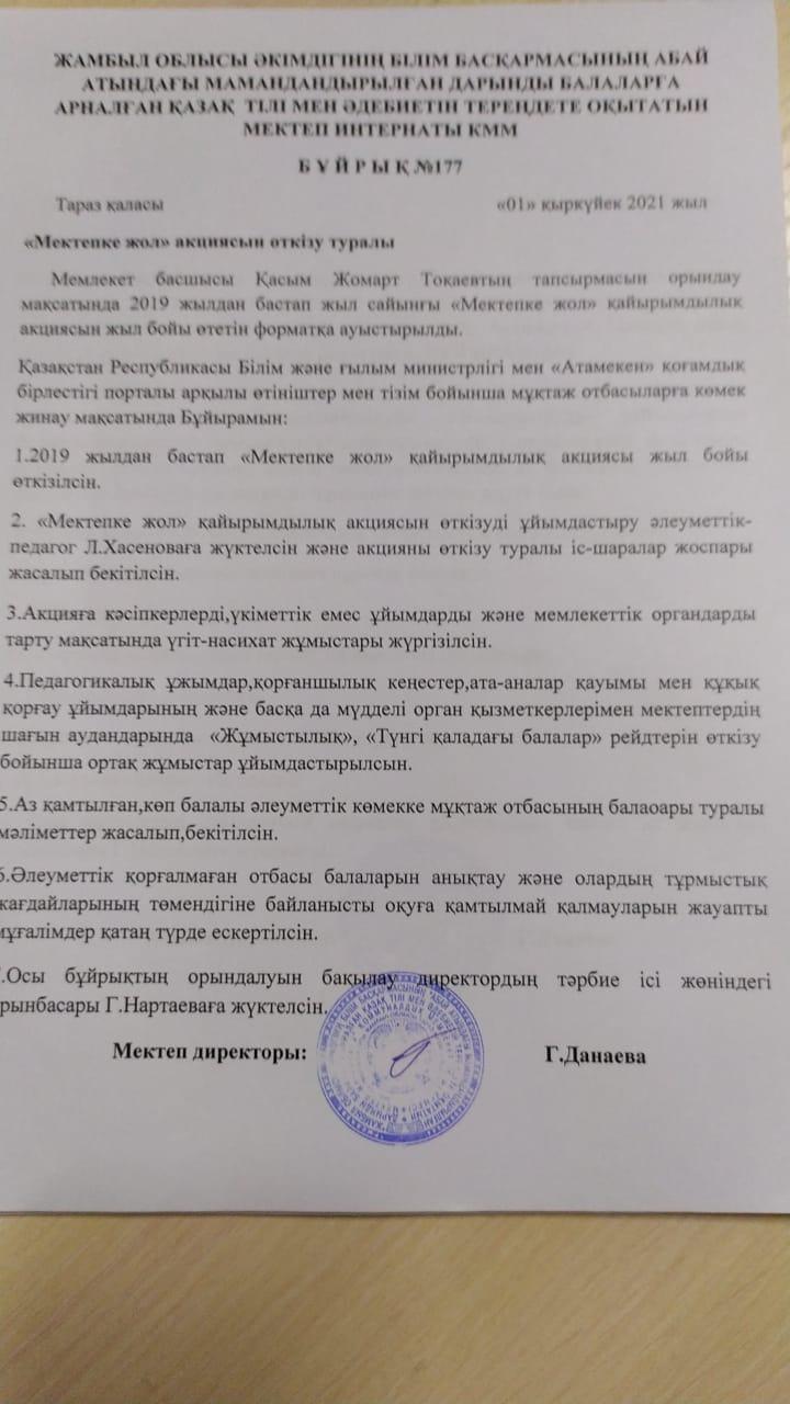 "Мектепке жол" акциясы өткізі бұйрығы