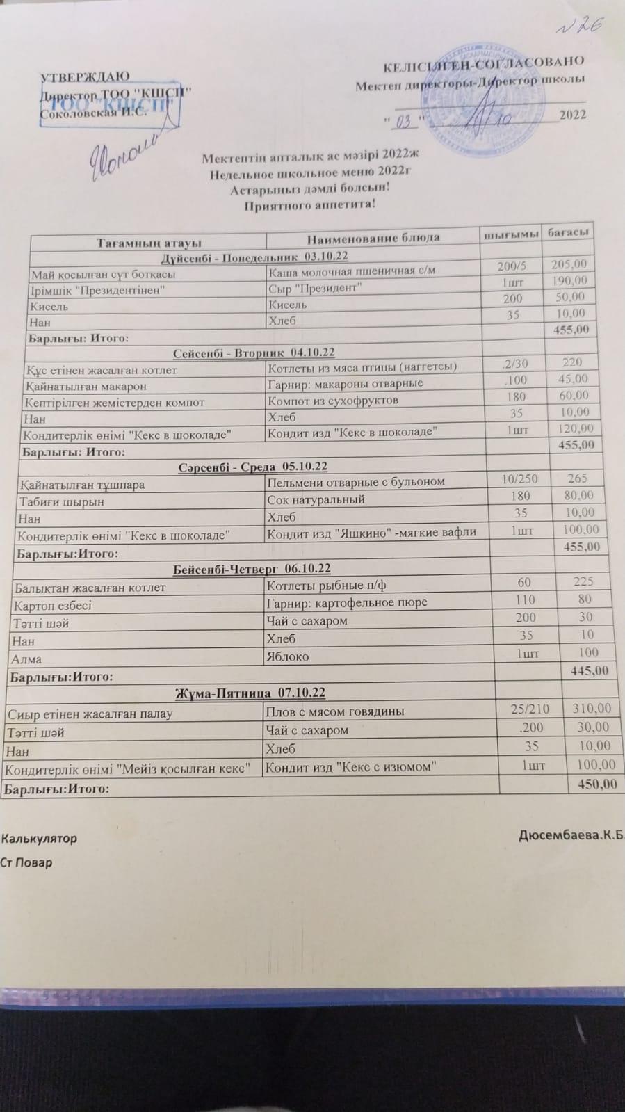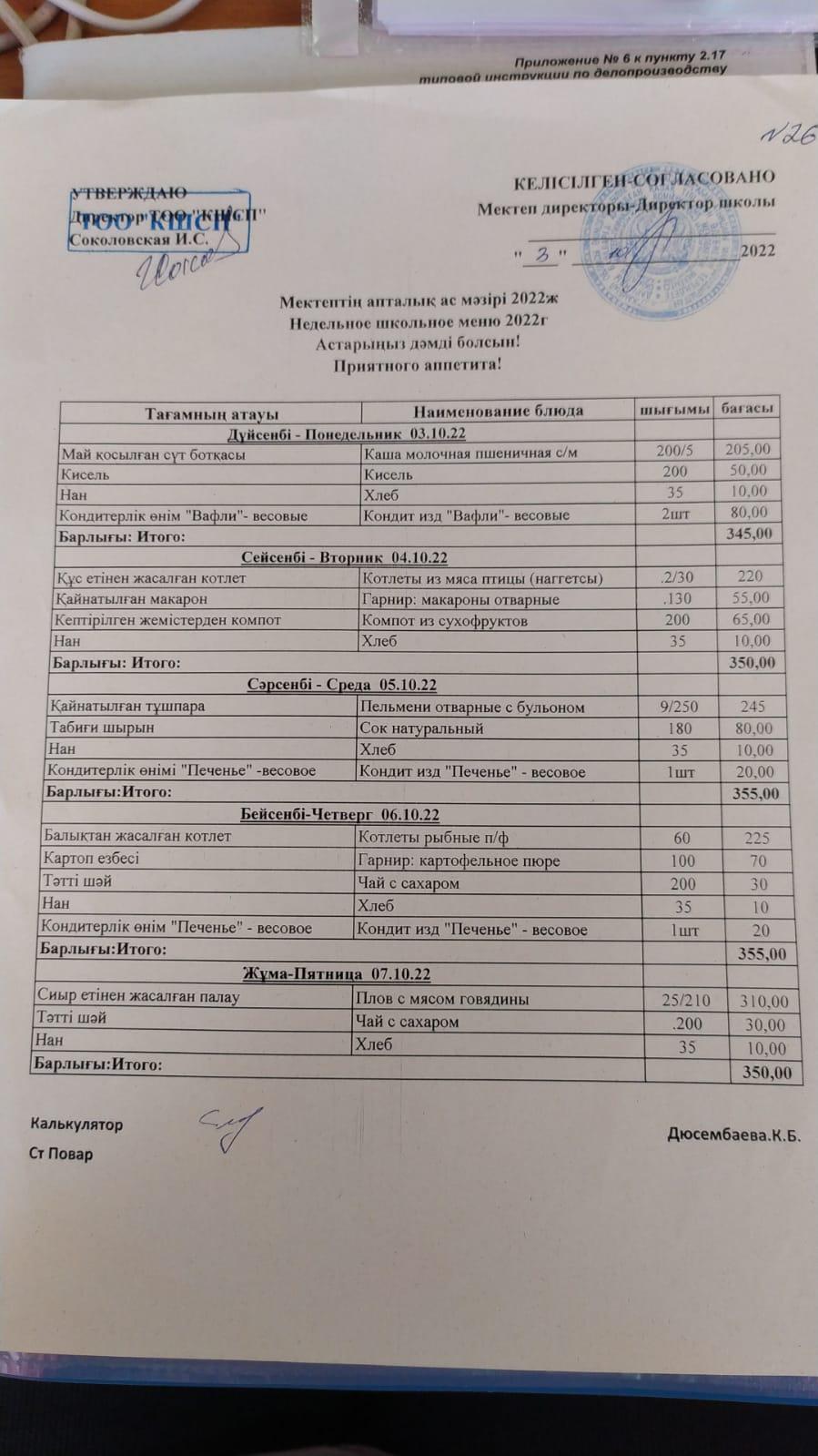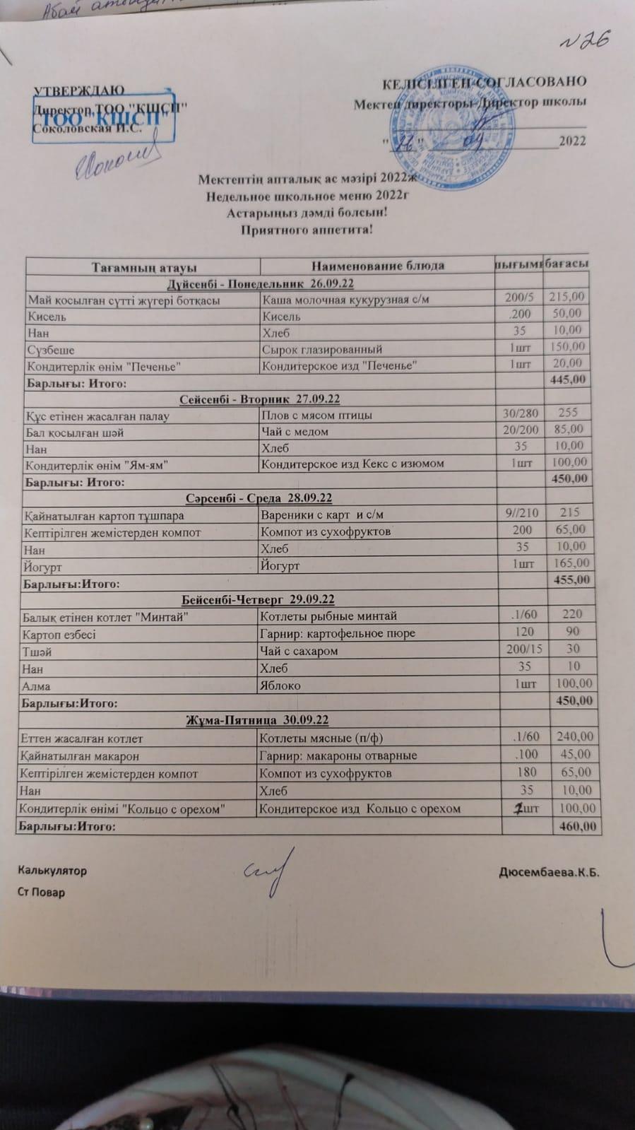 24.02.2020-28.02.2020 Ақпан айындағы апталық ас мәзірі