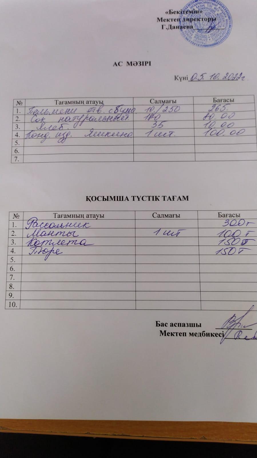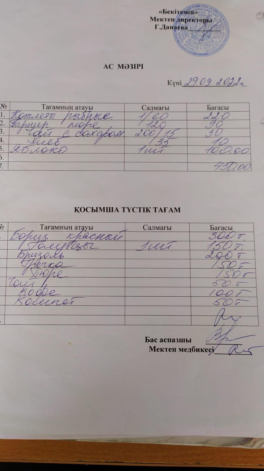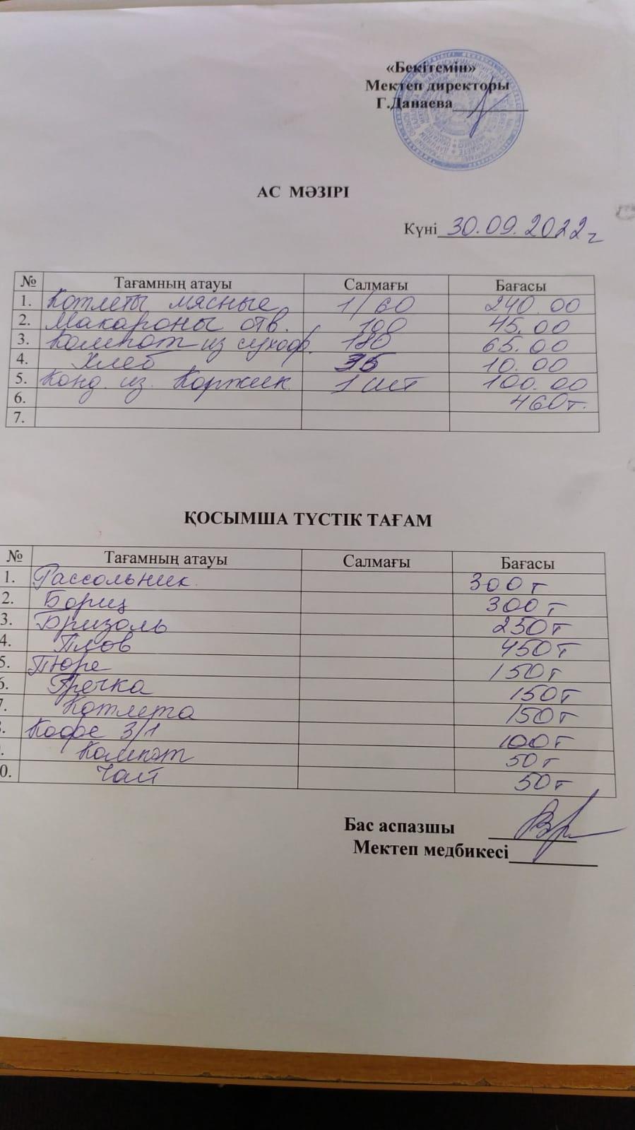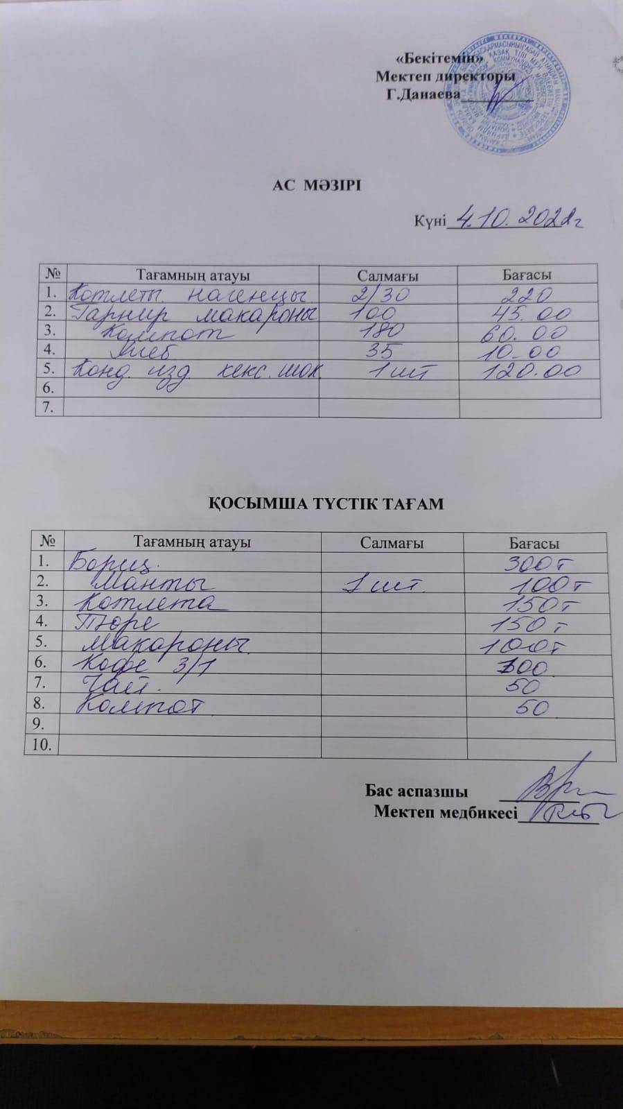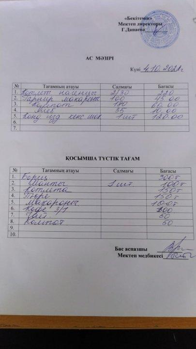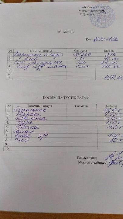 Асханадағы ас мәзірі Қараша айы