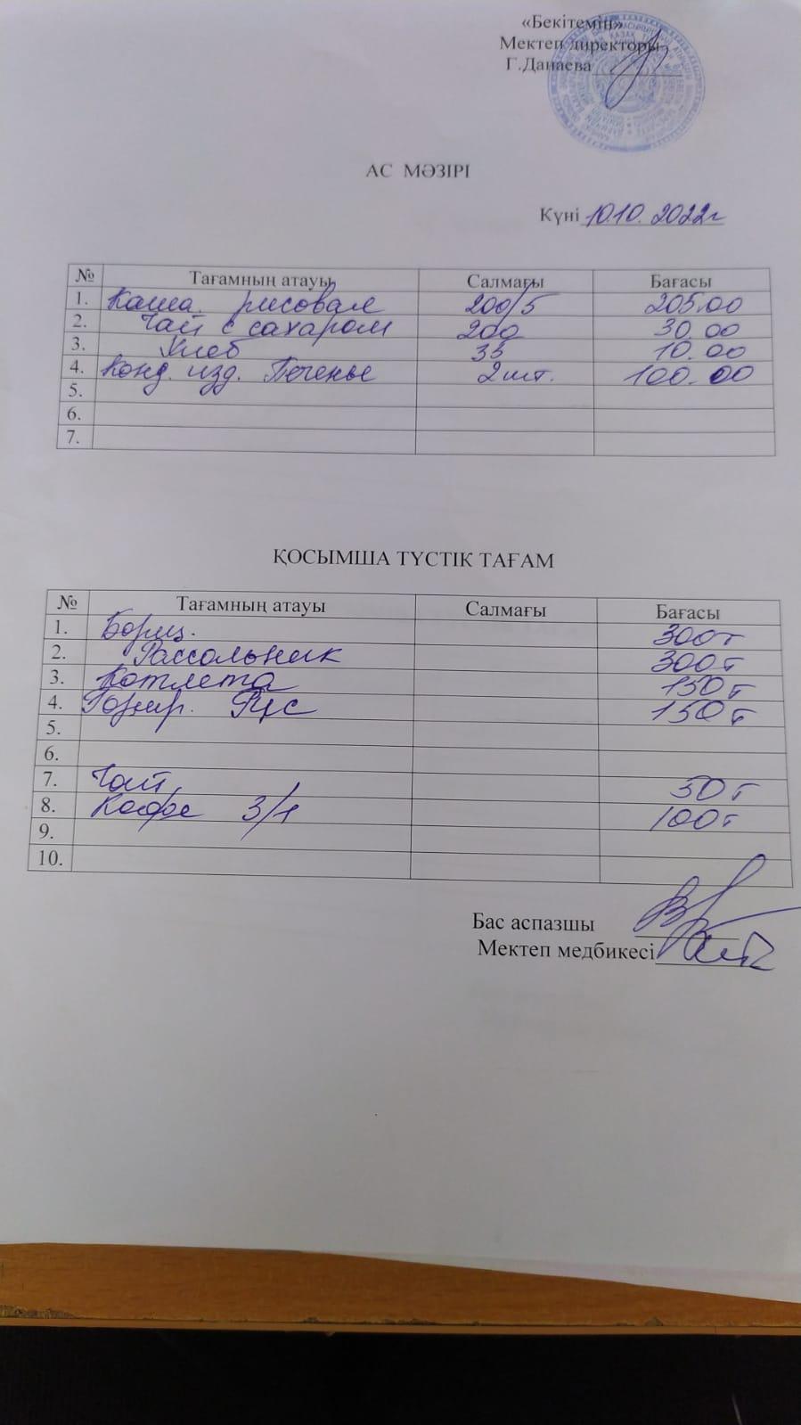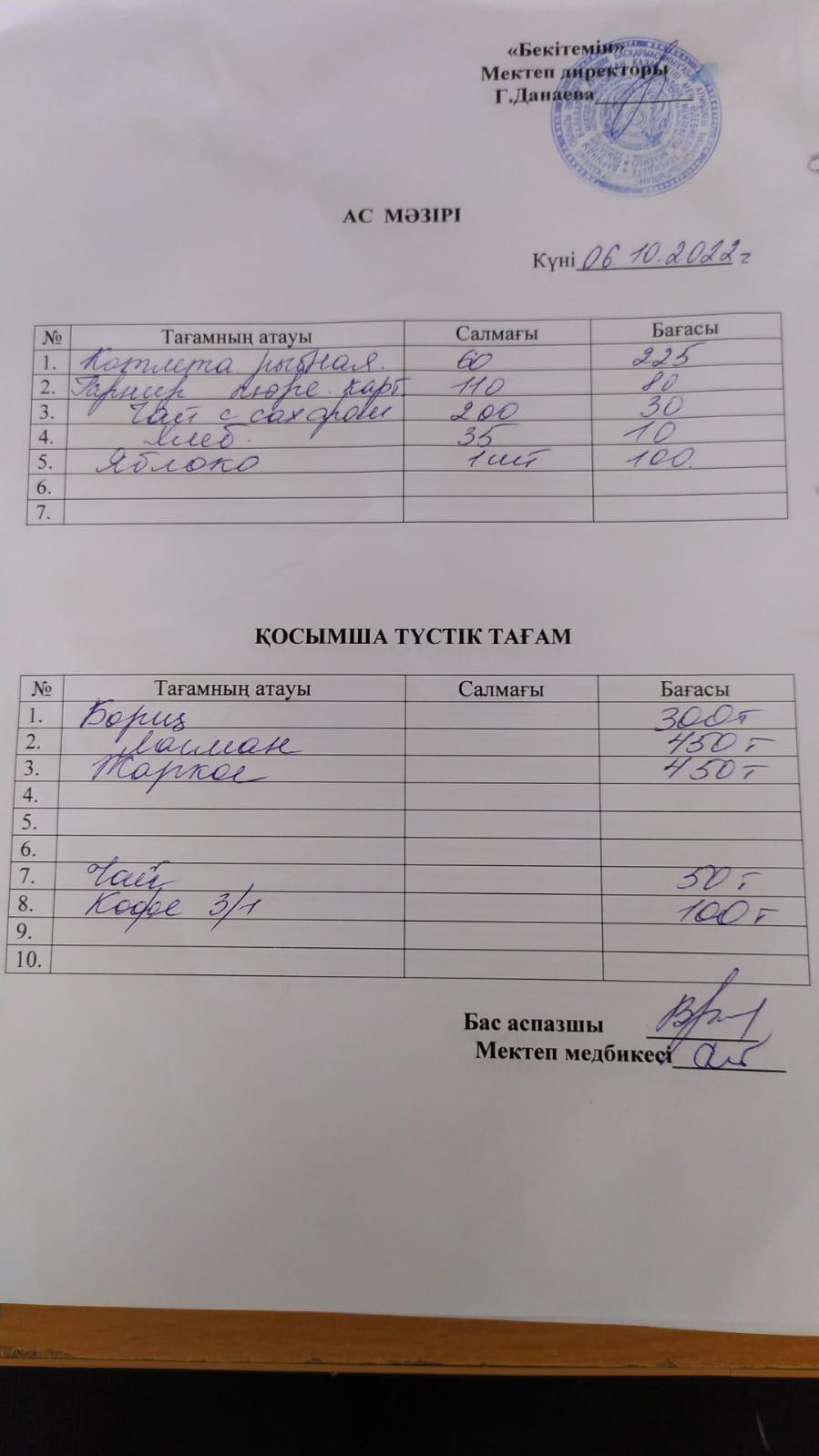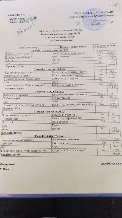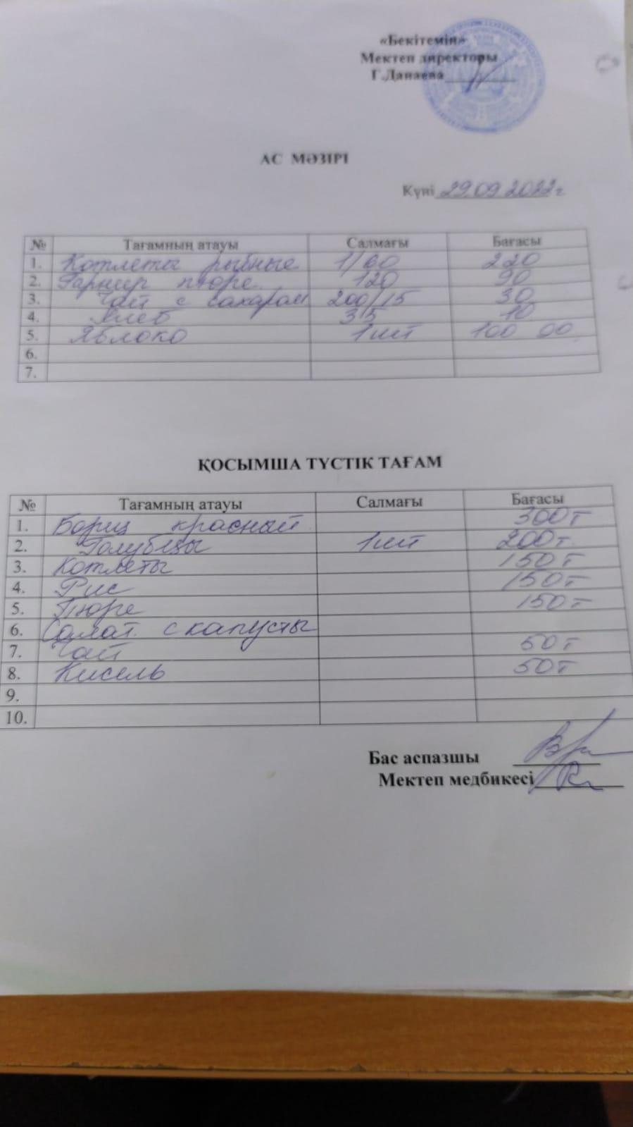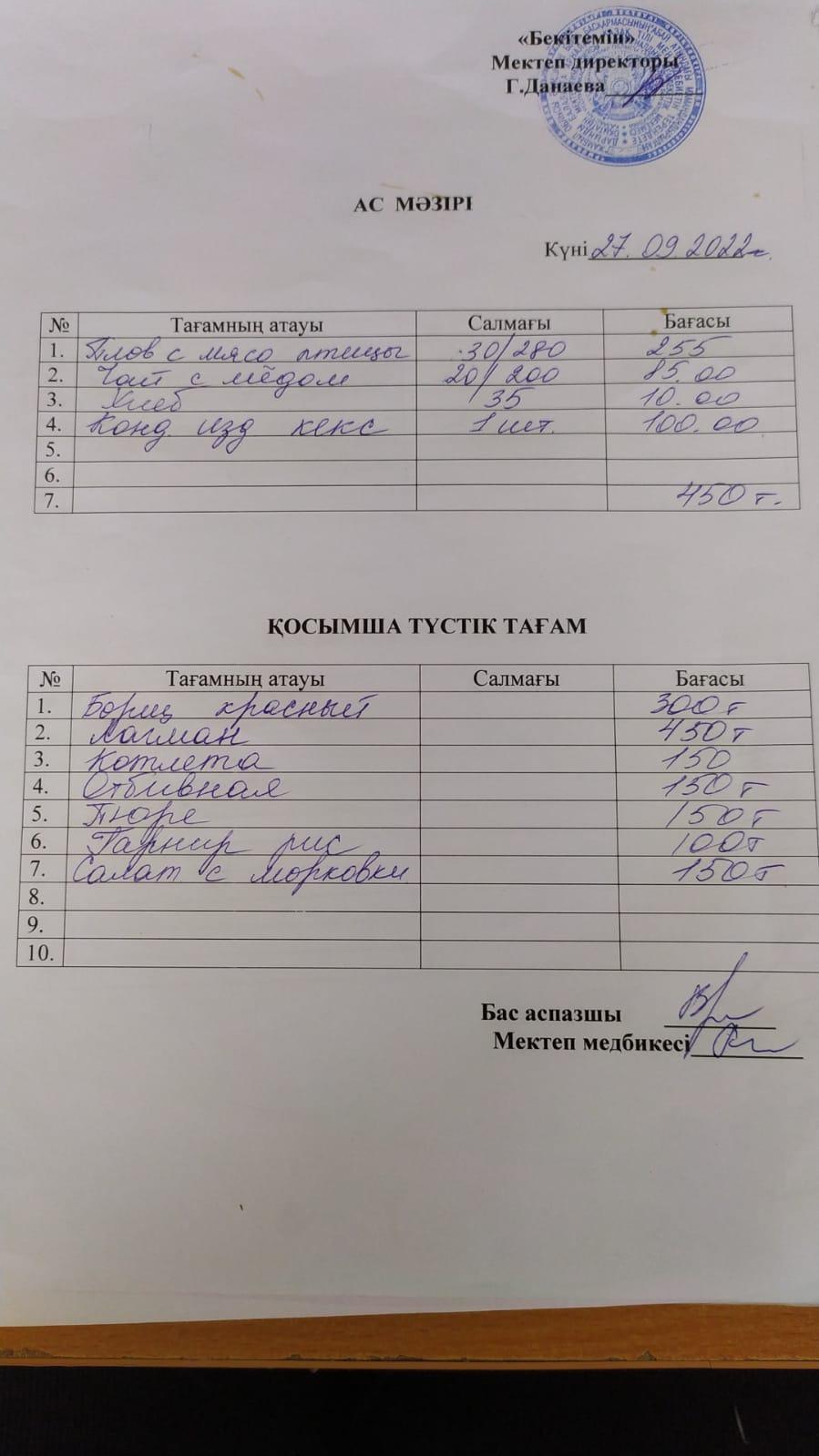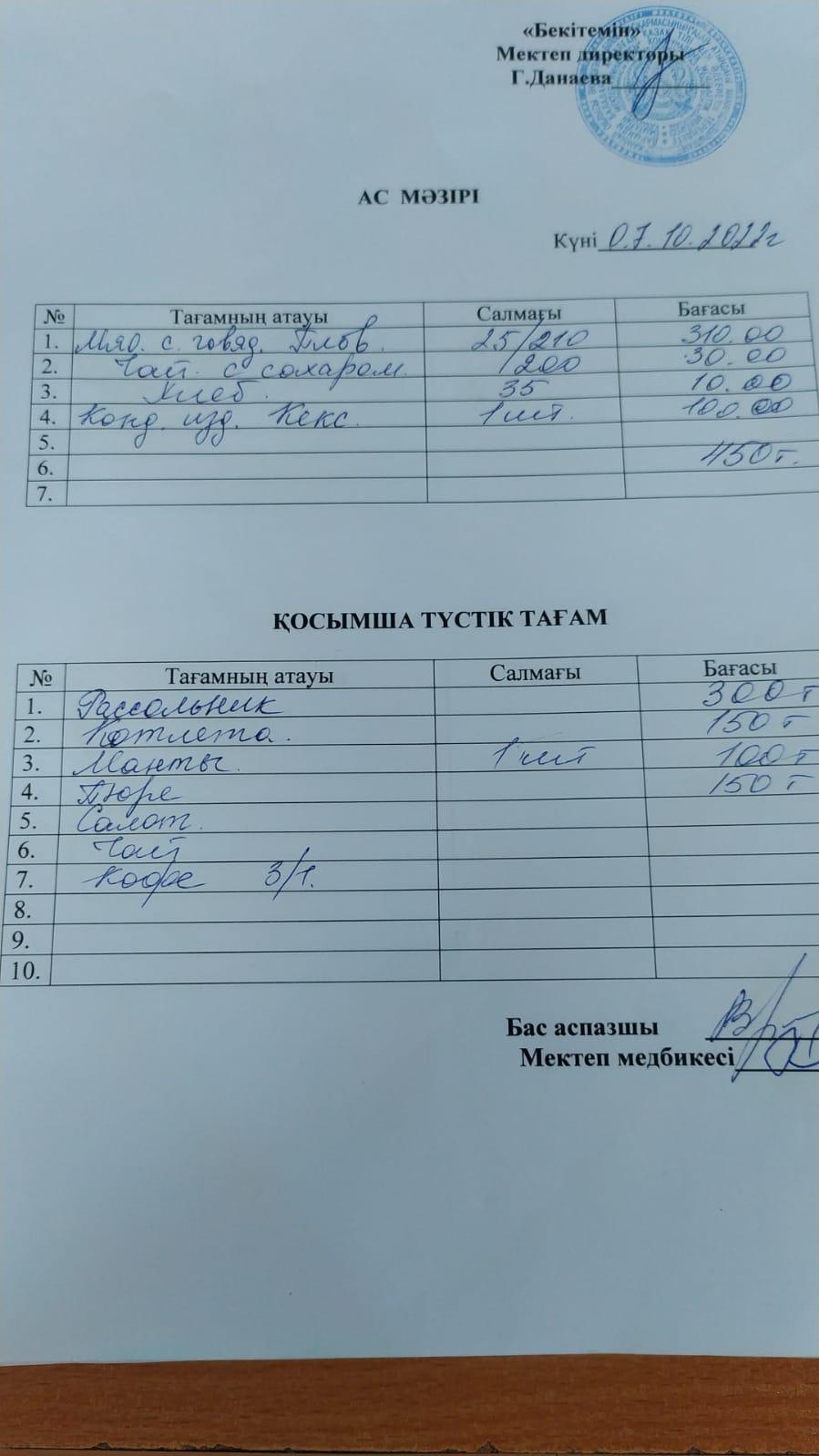 Асханадағы ас мәзірі Қараша айы