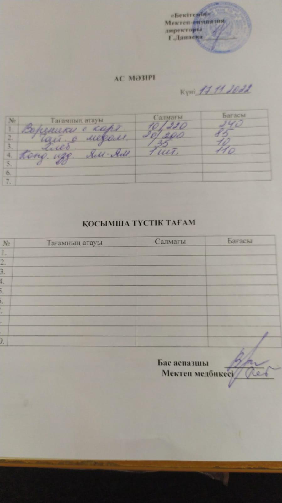 1 күндік ас мәзірі