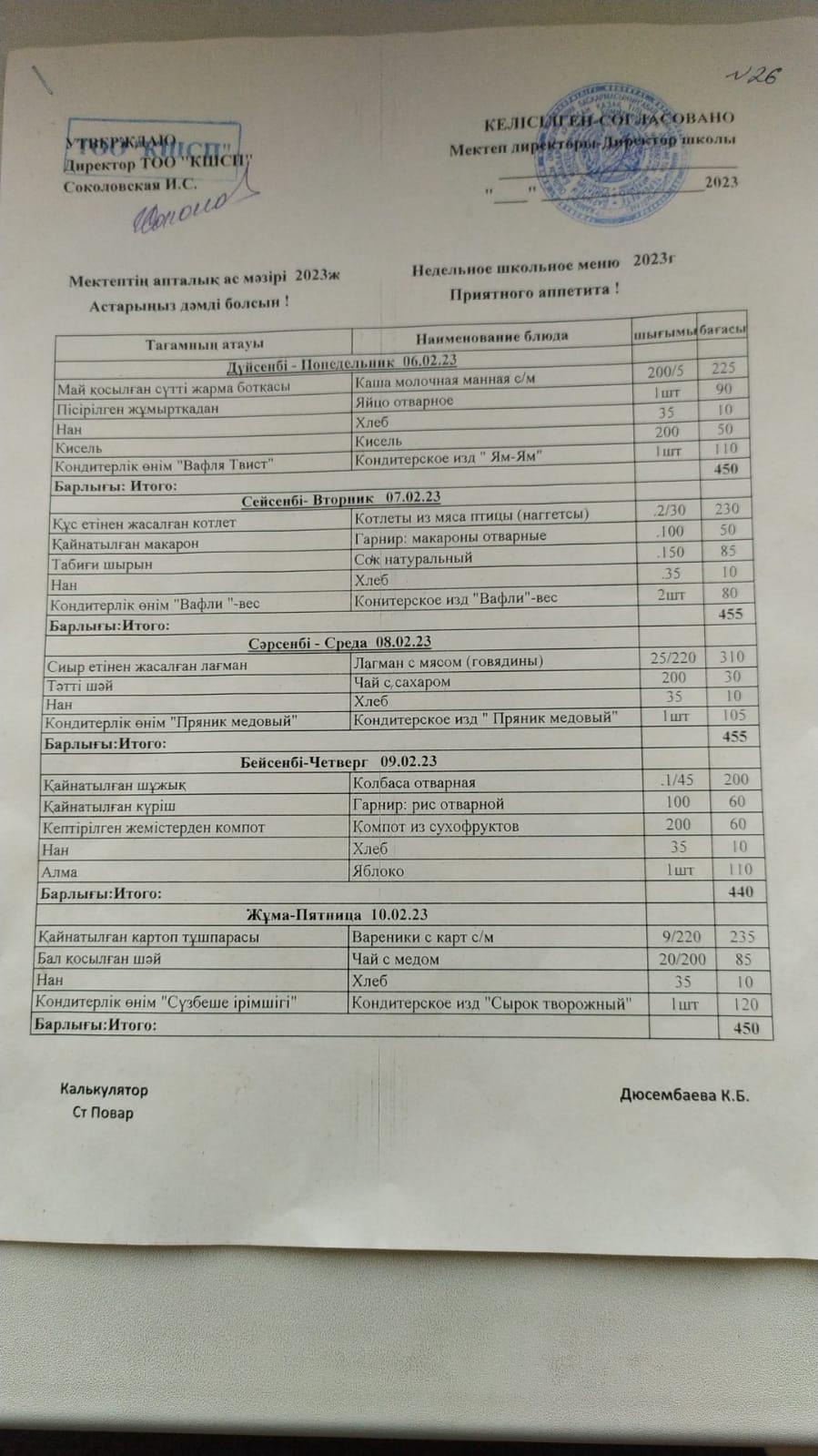 24.02.2020-28.02.2020 Ақпан айындағы апталық ас мәзірі