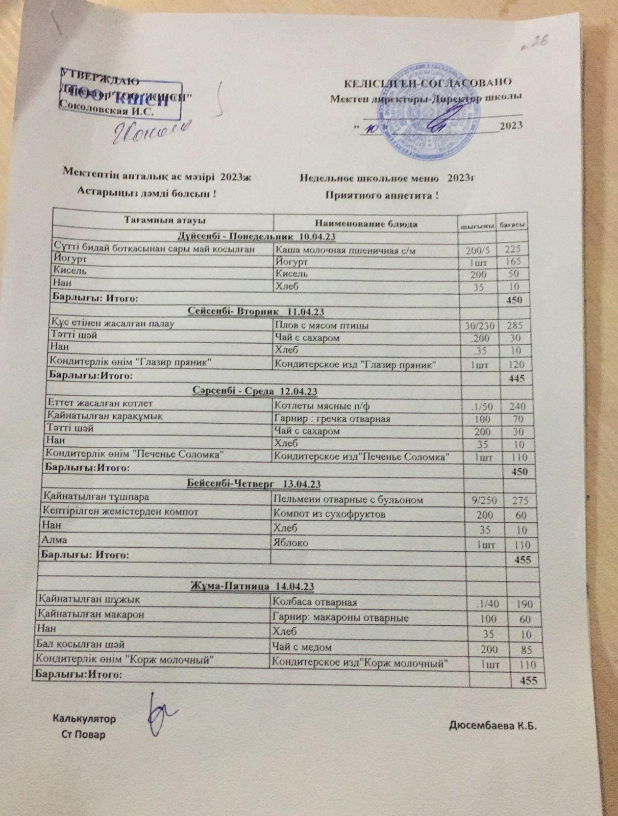 Мектеп асханасындағы тегін тамақ ішетін оқушылардың апталық ас мәзірі