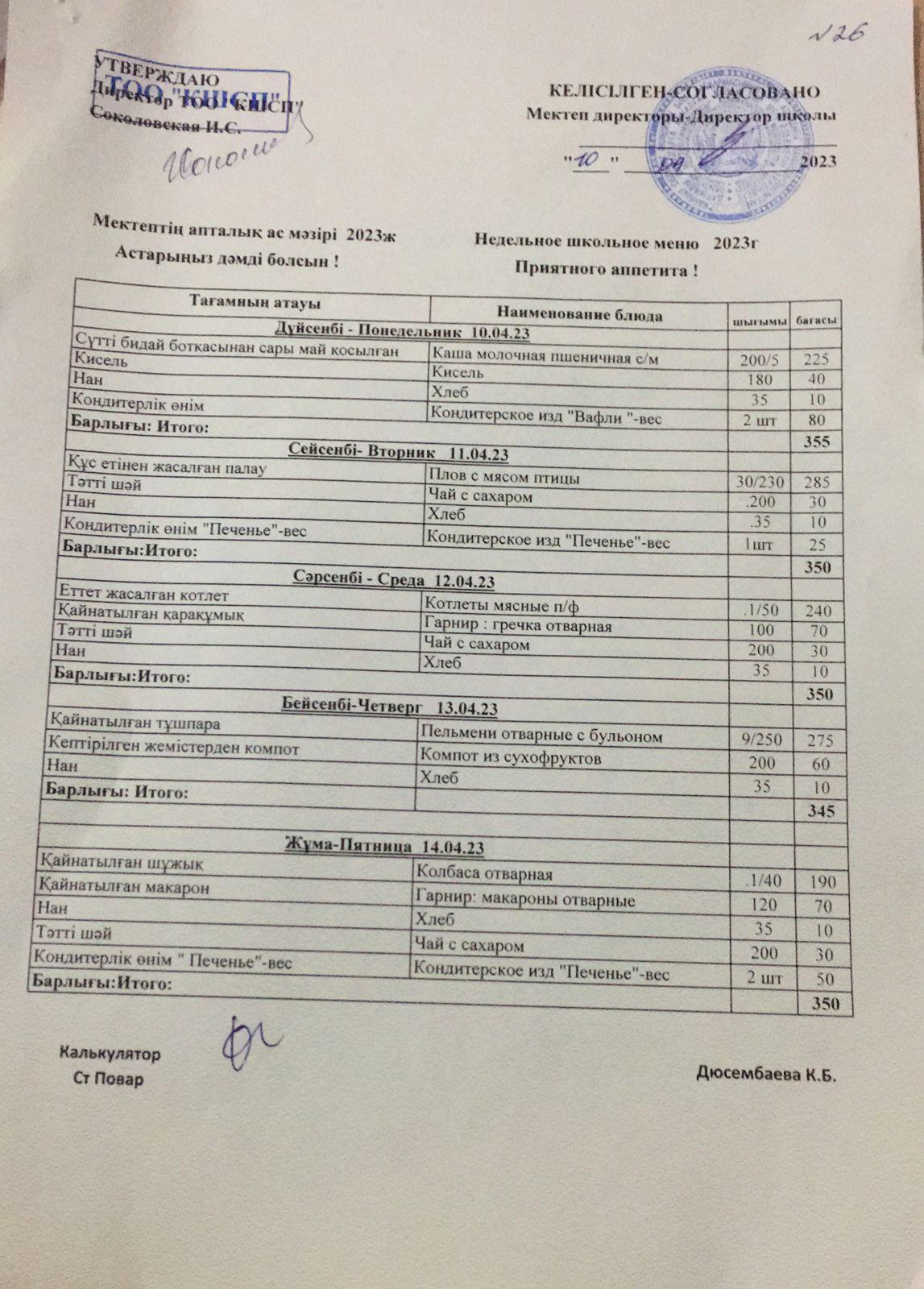 Мектеп асханасындағы тегін тамақ ішетін оқушылардың апталық ас мәзірі
