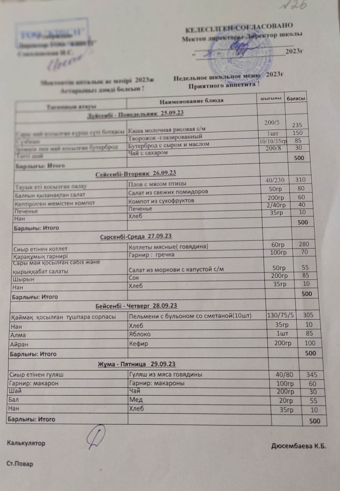 25.09-29.09.23ж.күнгі мектеп асханасының апталық ас мәзірі