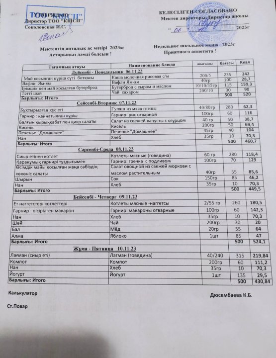 » 06.11-10.11.2023 ж.күнгі апталық меню