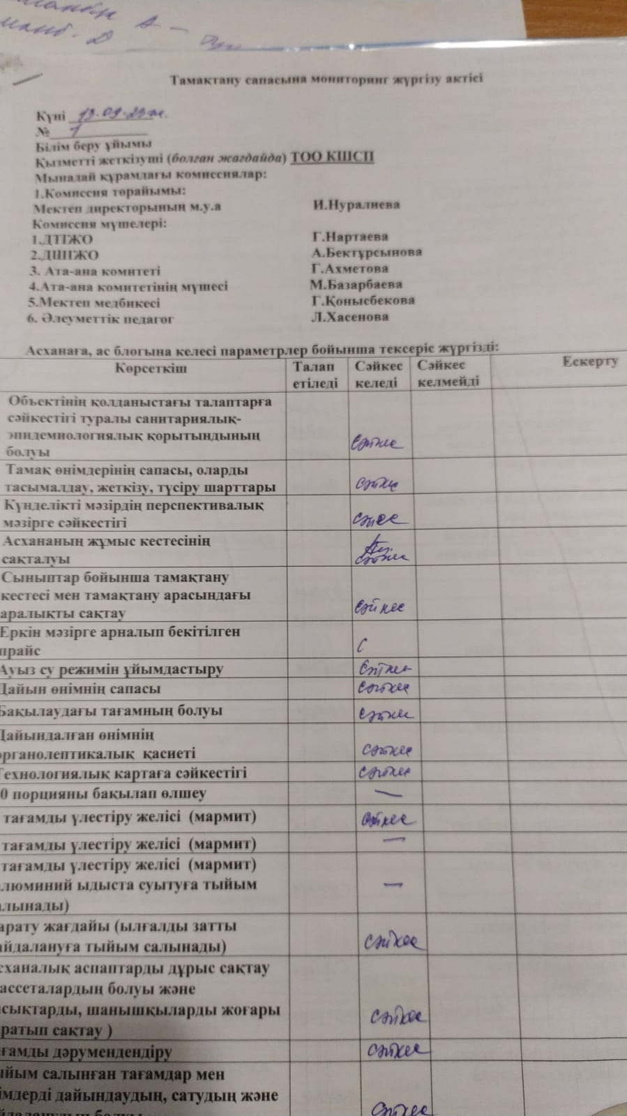 Бракераж комиссиясының асхананы тексеру актісі