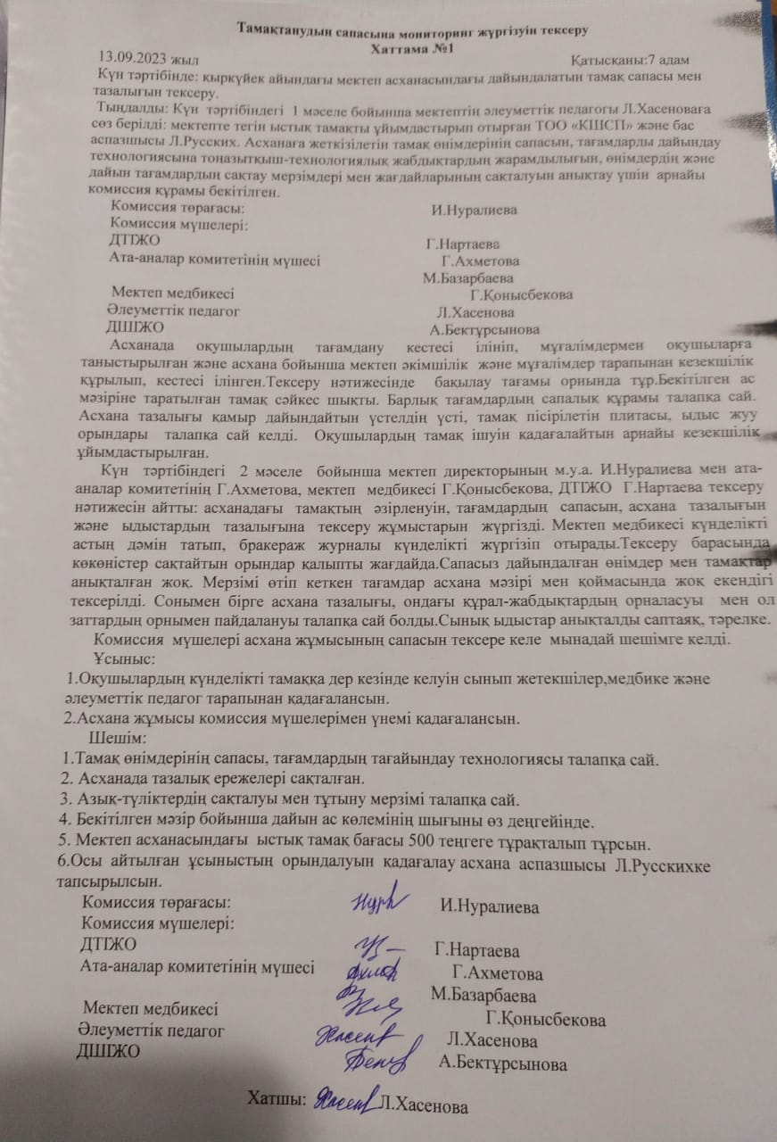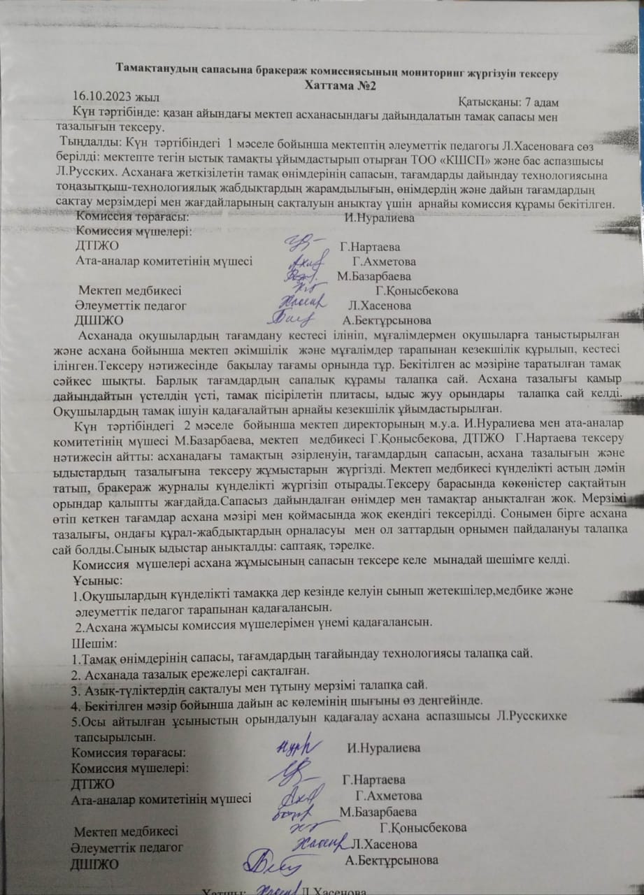 Тамақ сапасына бақылау бойынша бракераж комиссиясын құру бұйрығы
