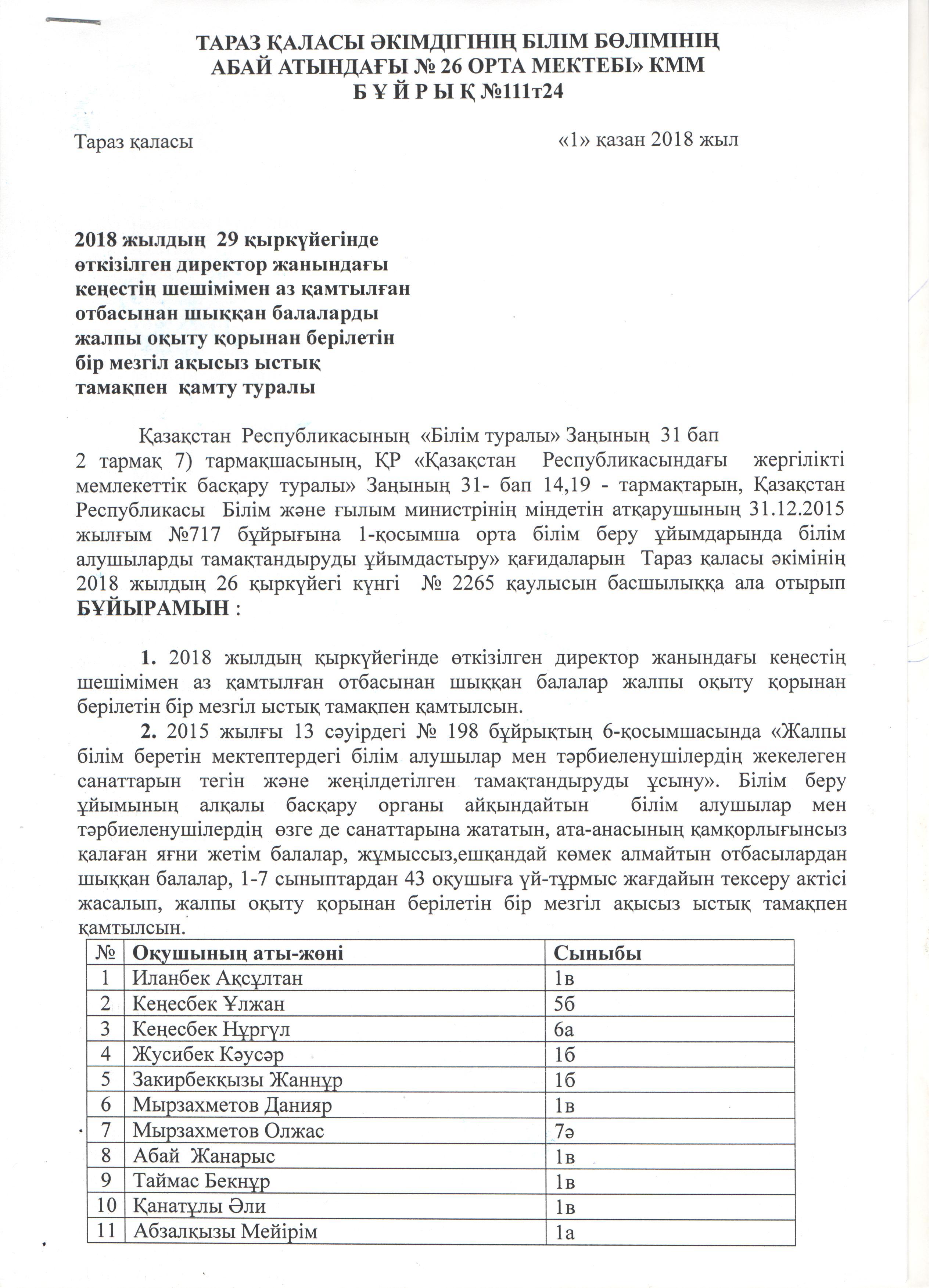 22 ноябрь 2018 20 1 2 3 4 5 Аз қамтылған отбасынан шыққан балаларды ыстық тамақпен қамту туралы бұйрық
