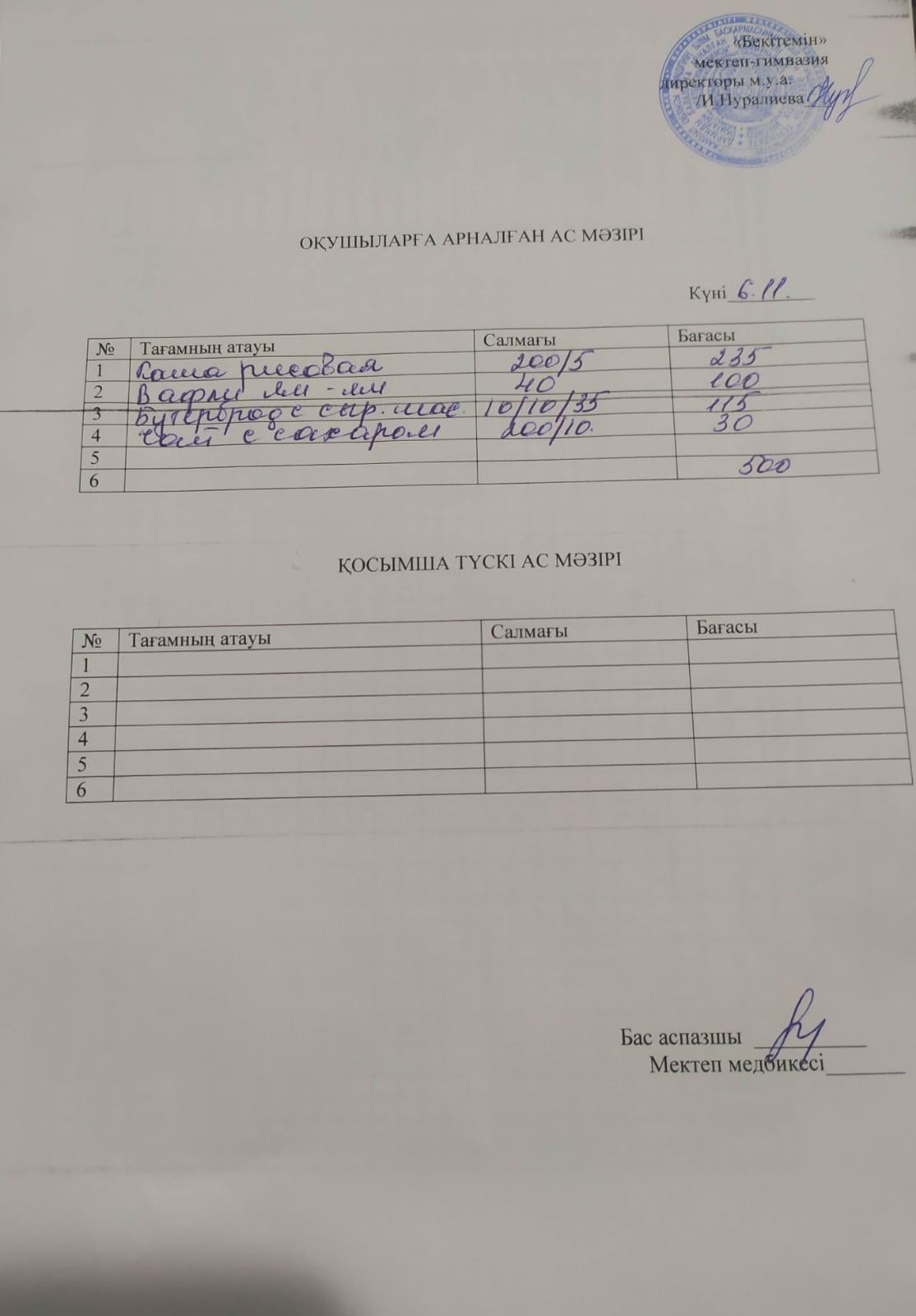 » 06.11.23ж бір күндік меню